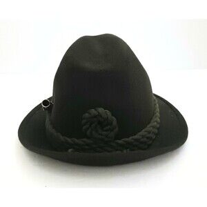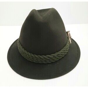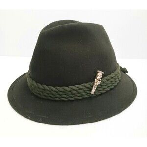 The VTG Huckel Tyrolean Dark Green Wool Felt Hunting Mountain Hat is a vintage men's accessory with a classic fedora style. Made in Germany from felted wool, this hat is the perfect addition for those who enjoy outdoor activities, or the Tyrolean aesthetic. The dark green color and braid trim add a touch of rugged sophistication, the brim is accented with a silver horn pin, making it a standout piece for the winter and fall seasons. With its solid pattern and high-quality materials, this hat is sure to make a statement wherever you go. Hat has an inner circumference of 22"/ size med. Originally sold by A Breiter in Munchen. This vintage piece is in great condition, no rips or stains. the wool is soft not too stiff, with a leather inner hatband for shape. The brim can be worn down or flip up the back, your choice. Hat ships boxed for protection.