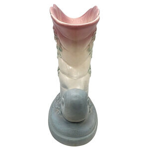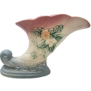 The VTG Hull Art Pottery Cornucopia Vase in pink and blue is a vintage decorative collectible made of pottery. This medium-sized vase features a floral pattern and a matte finish, perfect for all occasions. Produced by Hull, a United States art pottery studio, this original Wildflower W-7 7-1/2 model is unboxed and showcases a unique design that adds a touch of artistry to any space. Ideal for adults and collectors of vintage items, this vase is a charming addition to any home decor.