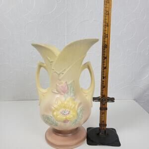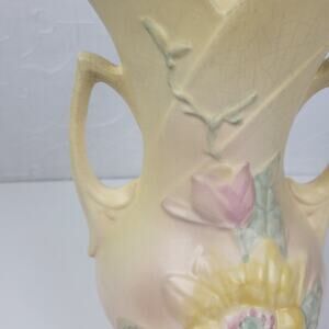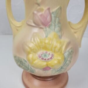 VTG Hull Pottery Magnolia Flower Vase Footed Matte Yellow 2 Handle Art Nouveau