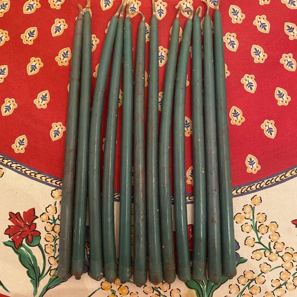 Here is a set of 12, 10-inch, green tiny taper candles which I'm *99%* sure are Carolina candles (Carolina Soap & Candle Makers Company). These came from a large box of candles, some were wrapped and listed earlier, findable in my closet. Several more were unwrapped, which I am now posting. The candles have never been used, but the color is no longer pristine due to the way they were stored as mentioned, and also shown in photos. All those still packaged/boxed were from the late-1970s/early-1980s, for reference. This would be a full set of 12, as they were then sold.