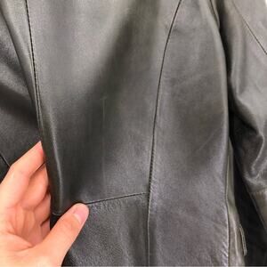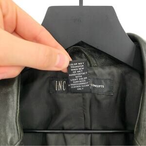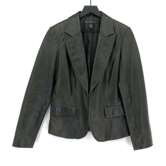 Vintage INC International Concepts Leather Jacket in a deep olive green. Classic silhouette, collar and lapels, two front pockets, straight arms. Fully lined, hook clasp closure, accent stitching along the lapel seams.
