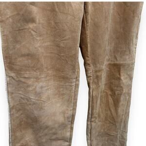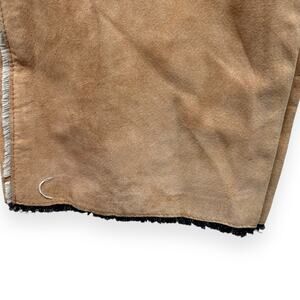 These pants are super one-of-a-kind. Exterior is tan suede with raw edges and denim lining.