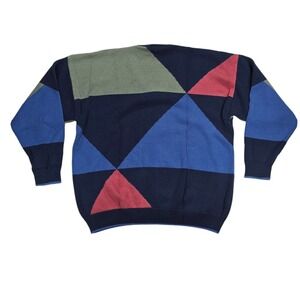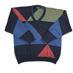 VTG IZOD V Neck Sweater Mens XL Blue Argyle Colorblock Oversize Heavy Knit 80s