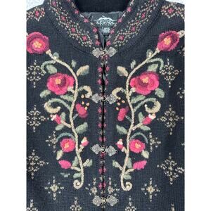 vintage icelandic design sweater wool womens medium lined clasp hooks rose floral knit norway norwegian fair isle warm cozy winter snow cottagecore grandmacore handmade traditional embroidered boho artisanal quality