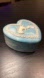 Charming heart-shaped trinket box with unicorn design. Features a blue base with white accents.