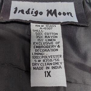 The Indigo Moon Jacket is a vibrant women's plus size 1X jacket featuring embroidered patchwork in a geometric pattern. Made from a comfortable cotton blend outer shell with a polyester lining, this lightweight jacket is perfect for all seasons. The long sleeves, button closure, and shoulder pads add to its functionality and style. With bohemian and art-inspired accents, this vintage piece is ideal for travel, parties, or casual wear. Perfect for any occasion, this Indigo Moon jacket is a colorful and unique addition to any wardrobe.