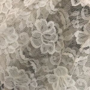 Dress is sleeveless with lace at the high neck and 11” at the hem