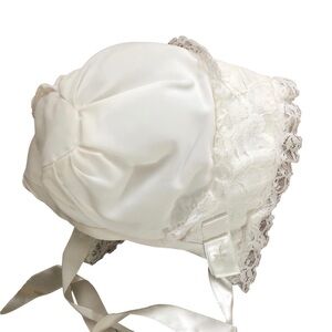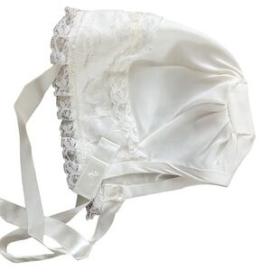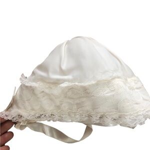 The bonnet is the sweetest/ matching the lace in the whole ensemble ivory ribbon trim and ties under neck. This would be for an infant 12 months and younger I believe.