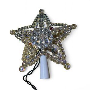 VTG Iridescent Clear Plastic Star Christmas Tree Topper with Multi-Color Lights. Beautiful, glowing holiday topper featuring an iridescent finish that shines in multiple colors when lit. Worked when plugged in. Perfect for adding a festive touch to your Christmas décor. Fair preowned condition.