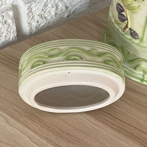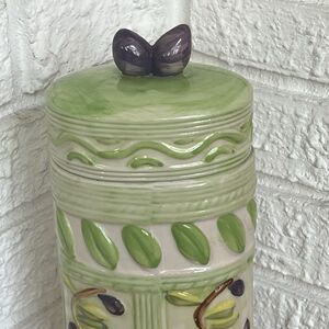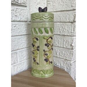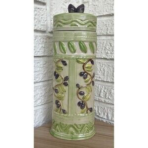 VTG Italian Oval Ceramic Pasta Spaghetti Canister Jar 3-D Olives Tall Lidded
