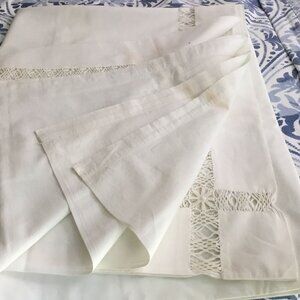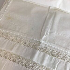 Care Instructions: Due to long-term storage, spotting occurs. For best results, professional laundering is recommended. Gentle cleaning methods will help preserve the muslin cotton and delicate hemstitch detail.