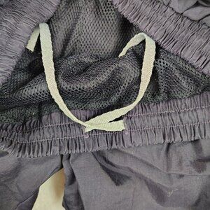 Black windbreaker nylon track pants with mesh lining for breathability , elastic waistband with inner drawstring and elastic ankle cuffs