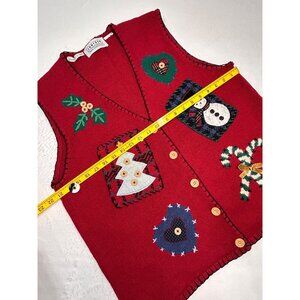 Cute 80s–90s holiday vest with hand-finished appliqué patches including a snowman, Christmas tree, holly, hearts, and candy cane. Deep red knit with decorative faux-wood buttons. Good preowned condition overall—some light staining on the tree patch and light pilling on the snowman (felt material naturally pills). Structurally very sound with no holes or major flaws. Please see all photos for close-ups.