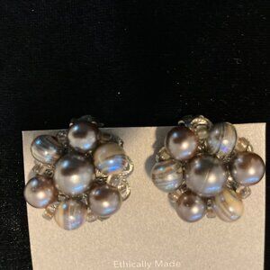 VTG JAPAN MCM Iridescent Dark Gray Beaded CLIP ON EARRINGS 1"