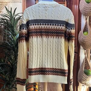 The sweater is likely acrylic based on feel and era, with a soft mid-weight knit that wears well without itch. The vertical cable texture, combined with the horizontal patterning at chest, hem, and cuffs, creates a balanced and timeless silhouette. Whether styled with denim for a retro moment or worn as a comfy cold-weather essential, this one's a total vintage win.