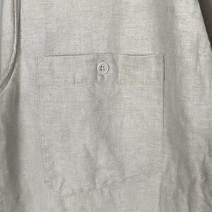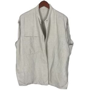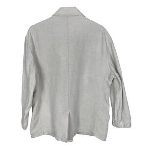 Classic 100% linen button front blazer. Unstructured with four button front, two front pockets, single back vent. Internal buttoned pocket. No lining. Beige. Relaxed fit. Size large. Please see photos for measurements.