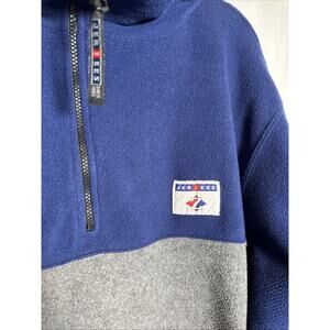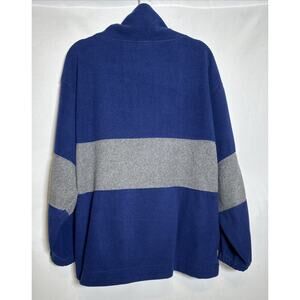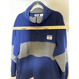 This vintage JERZEES sweater is a classic piece for any outdoor enthusiast. With a blue color block pattern, long sleeves, and a mock neck, this sweater is perfect for the colder seasons of fall, winter, and spring. Made from a combination of polyester, polyester blend, cotton, and cotton blend, this heavy fleece sweater is easy to care for and packable for all seasons.