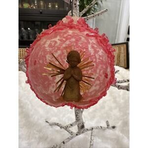 VTG JEWEL BRITE PINK SUGAR ANGEL TINSEL DIORAMA PLASTIC ORNAMENT