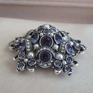 It features faux tanzanite, rhinestones and faux pearls in a silver tone setting.
