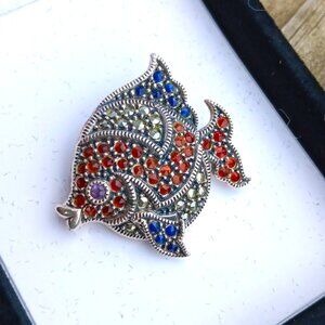 Gorgeous Vintage Sterling Silver Judith Jack Marcasite and Crystal Fish Brooch. Every stone is intact and the clasp works perfectly. Measures 1 1/4" long and 1 3/8" wide. Weight is 9.25 grams. Signed Sterling and JJ for Judith Jack.