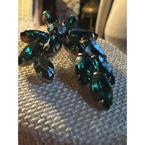 This exquisite vintage Juliana brooch features a beautiful emerald green marquise rhinestone with an AB round center stone. The asymmetrical shape adds to the beauty of the piece and it is made of alloy with a rhinestone material. The brooch is a true beauty and perfect for any fashion-forward individual.