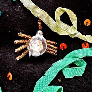 Black with very festive Halloween themed designs, embellishments on front: spider, seashell, moon, stars, round. sparkly orange disks