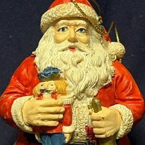 Vintage Santa Claus Ceramic Ornament Round Bottom Christmas Holding Toy Soldier & Bell