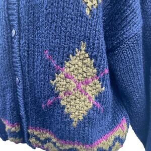 The VTG Jamie Scott Handknit Cardigan Sweater in size M features a classic argyle pattern with a chunky knit style and long sleeves, making it perfect for casual occasions in the winter and fall seasons. This vintage sweater has a crew neck and button accents, adding a touch of character with its grandpa and teacher themes. Made from a blend of ramie and acrylic, this cardigan is designed for a regular fit and is recommended for hand wash only to maintain its quality. The blue color and diamond pattern make it a stylish and cozy addition to any woman's wardrobe.