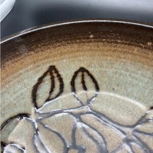 sgraffito technique of scribing through the first white layer of glaze before the second layer of brown is applied.no date on this item, but the style of decoration is in keeping with the work she was doing in the 1980s.