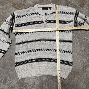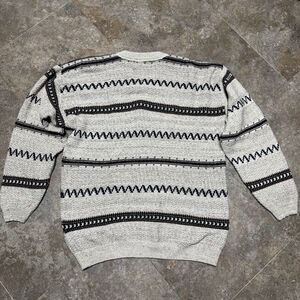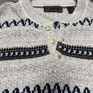 The VTG Jantzen Pullover Sweater is a vintage piece made of 100% cotton in a beige color, featuring a Fair Isle pattern with a fisherman character design. This chunky-knit sweater has a crew neck and long sleeves, making it suitable for casual occasions in the winter and fall seasons. With accents like buttons and a pullover style, this sweater is both stylish and comfortable, perfect for those who appreciate a retro look with a touch of nostalgia. Made in the United States, this sweater is sure to add a unique flair to any wardrobe.