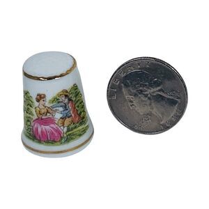 This vintage thimble is a beautiful piece that would make a great addition to any collection. The intricate hand-painted design showcases a figural couple sitting together, making it a perfect gift for anyone who loves sewing or collecting vintage items. Made in Japan, the thimble is crafted from bone china and features a Limoges style that adds to its charm. The thimble is in great shape and has been well-preserved over time. Its country/region of manufacture, Japan, is known for producing high-quality porcelain and ceramic items, and this thimble is no exception. The material is sturdy and durable, ensuring that it will last for years to come. This is a must-have for anyone who loves vintage thimbles or unique handmade crafts.