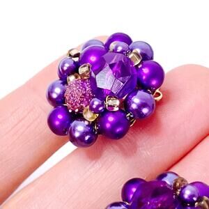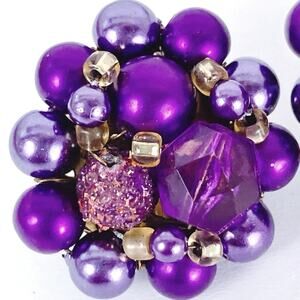 VTG Japan Mid Century Cocktail Earrings Purple Faux Pearl Bead Cluster Clip On