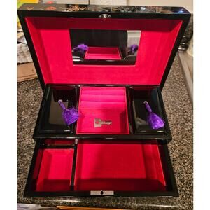 Vintage Japanese Lacquerware Jewelry Box, Hand-painted with Floral designs, Cherry Blossoms. Features Keyhole Escutcheon and a lock. Red velvet Interior multiple compartments: rings, 2 with purple tasseled lacquerware lids. Mirror inside lid, Japanese hand stamp under one velvet lid (9-sun-Hama) Bottom Label in Japanese: Mokusel ( Made of Wood) Sakura (Cherry Blossom) Music box compartment, doesn't work but intact, can be fixed?