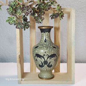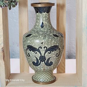 Keywords: jarrón cloisonné, jarrón japonés vintage, arte metálico, Japanese cloisonné vase, enamel copper vase, cream black gold vase, 1930s Japanese décor, antique Asian home accents, collectible cloisonné, Art Deco enamel vase, vintage