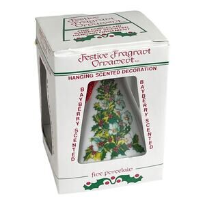 • Vintage scented hanging Christmas ornament by Jasco is four-sided porcelain in original box. Each side is decorated with red holly berries, green leaves, and white flowers.