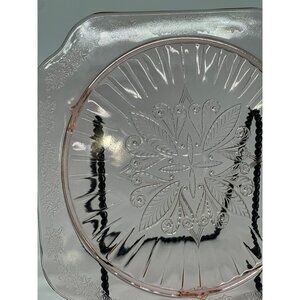 This vintage pink Depression glass plate features a beautiful floral etching. The 11-inch square shape is both elegant and functional, making it a charming addition to any collection.