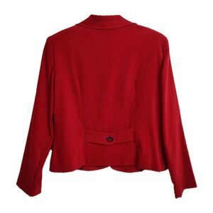 The Vintage Jessica Howard Suit Dress & Jacket in size 6 is a bold and stylish choice for any woman looking to make a statement. The red color, solid pattern, and long sleeve jacket design give it a classic and sophisticated look. Made from a blend of polyester and spandex, this 2-piece set features a jacket with a four-button front and a matching dress. The lined interior ensures a comfortable and flattering fit, making it a versatile addition to any wardrobe.