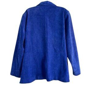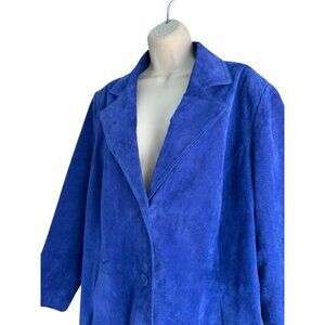 Jessica London woman's suede blazer jacket. Jacket is done in a beautiful royal blue. It has a button up front and notch collar. Blazer is made of suede and has a polyester lining. It's a woman's size 18. Being vintage please see measurements to ensure fit.