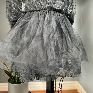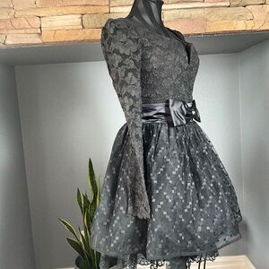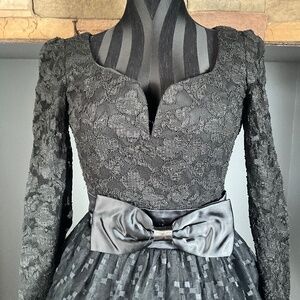 Stunning - Vintage Jessica McClintock Gunne Sax Black Lace Mini Dress, Sweetheart Neckline, Long Lace Sleeves, Large Bow @ Waist, Back Full Zipper Closure, Layers of Tulle, Lace Trimmed Lining