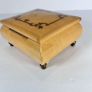 This VTG Jewelry Music Box is a unique and handmade piece made in Italy by the San Francisco Music Box Co. Measuring 4.5x4x2 this music box is designed to store rings and features a charming tune. With its vintage appeal and high-quality craftsmanship, this piece is perfect for collectors or those looking to add a touch of nostalgia to their decor. Made in Italy, this music box is a timeless treasure that will surely delight any music box enthusiast.