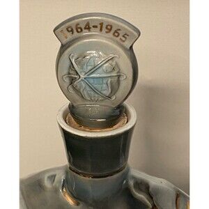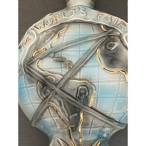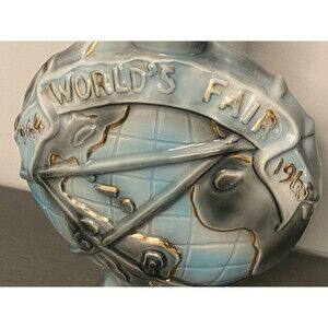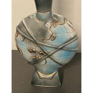 Vintage (empty) decanter bottle shaped like the earth. From 1964 World's Fair. Authentic item made for James B Beam Distillery Co. Made from Regal China. Blue and grey with gold metallic details.
