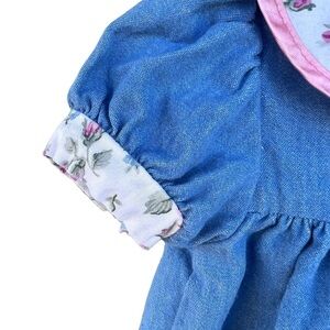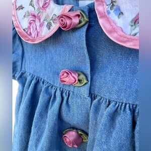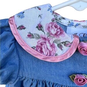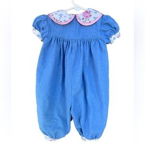 Vintage Jo Lene Cottagecore Chambray Bubble Romper. Baby size 12 months. Denim chambray with Cottagecore rose print Peter Pan collar and trim at arms and legs. Satin trim accent. Dainty satin rosette accents at the buttons on the front. Snaps make a diaper change easy. Total 90’s Cottagecore Laura Ashley & Shabby Chic vibes! Made in USA! Great preowned condition with light wash wear. No staining, no holes.