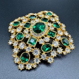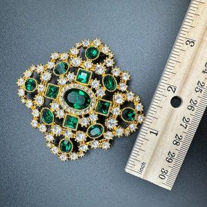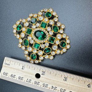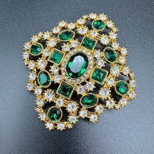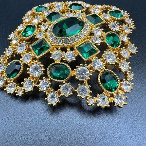 VTG Joan Rivers Gold Plated Emerald Green Clear Swarovski Crystal Large Brooch