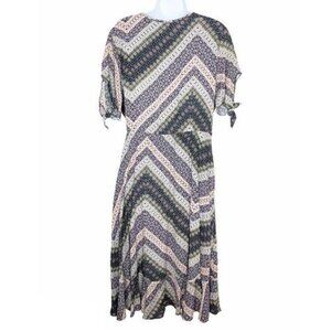 This vintage Jody California dress blends charming cottagecore aesthetic with a herringbone floral pattern. Its lightweight fabric ensures comfort, while the short sleeves and flowy skirt offer timeless elegance for a whimsical wardrobe.