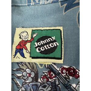 Channel the effortless cool of the golf course with this vintage Johnny Cotton Men's Button-Down Shirt. Perfect for a retro-themed party or a casual day out, this blue shirt features a fun, "Caddy Shack Golf Pro"-inspired print. Made in the USA from 100% cotton, this classic short-sleeve button-down is both comfortable and stylish. This size Large shirt has flat-lay measurements of 26 inches from pit to pit and a length of 32 inches.
