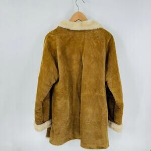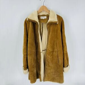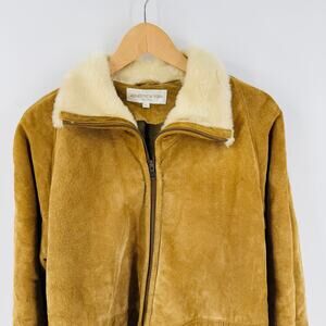 VTG Jones New York Shearling Trim Suede Coat Camel Tan Zip Front Size L Large
