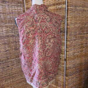 The VTG Jones New York Sleeveless Blouse is a vintage-inspired top made from a luxurious silk-linen blend in a paisley pattern. This chic blouse features a V-neckline, wood buttons, and side slits for a stylish and lightweight design perfect for various occasions such as travel, weddings, parties, and workwear. The red, green, and beige color palette adds a touch of retro charm, making it a versatile piece for any season. Made by the reputable brand Jones New York, this blouse is a must-have for women looking to add a touch of vintage flair to their wardrobe.