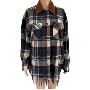 Features a brown corduroy collar, soft wool-blend plaid fabric in shades of brown, blue, and cream, and a fringed hem for that effortless Western-meets-grunge vibe.