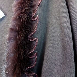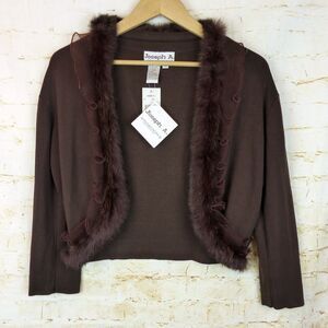 Joseph A, faux fur trim cardigan, silk blend sweater, brown cropped cardigan, womens XL, vintage style, y2k, bolero jacket, holiday cardigan, y2k, coquettecore, balletcore, quiet luxury, cabincore, soft glam, romantic academia, vintage inspired, fall cardigan, retro chic, dressy sweater, minimalist, soft knit, ruffle trim, lightweight knitwear, elegant, made in China, stretch fabric, party outfit, retro glam, classic cardigan, NWT