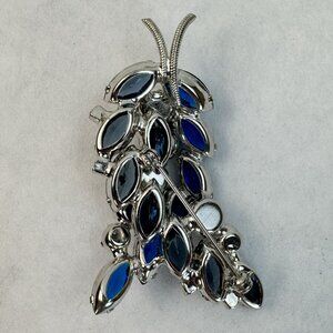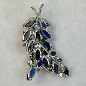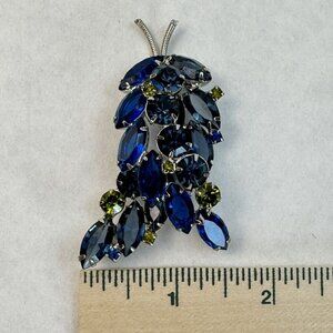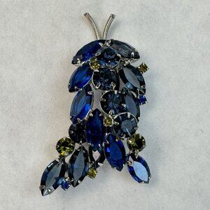 This vintage brooch features a timeless silver-tone leaf design adorned with blue and green glass rhinestones. Its intricate craftsmanship appeals to collectors and fashion enthusiasts.